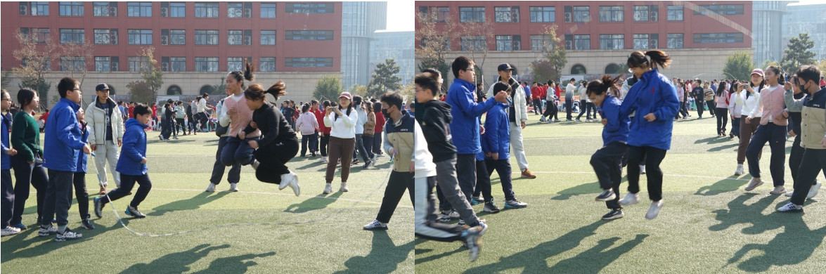 五、六年级的“8字交替循环跳长绳”难度升级。同学们丝毫不惧,搭档们两人一组,挽着手,步调一致,在绳间轻松穿梭跳跃。
